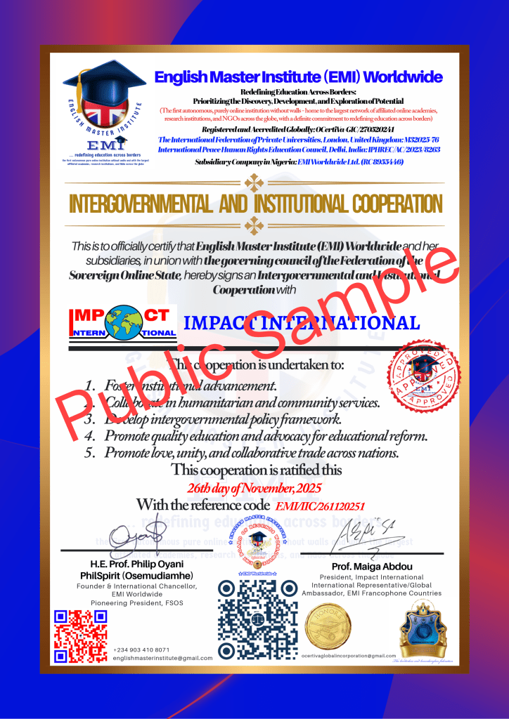 The English Master Institute (EMI) Worldwide, in partnership with the Governing Council of the Federation of the Sovereign Online State (FSOS), announces the formal signing and ratification of an Intergovernmental and Institutional Cooperation Agreement with Impact International. This development marks a major strategic step in strengthening international collaboration, improving global education systems, and advancing humanitarian engagement.