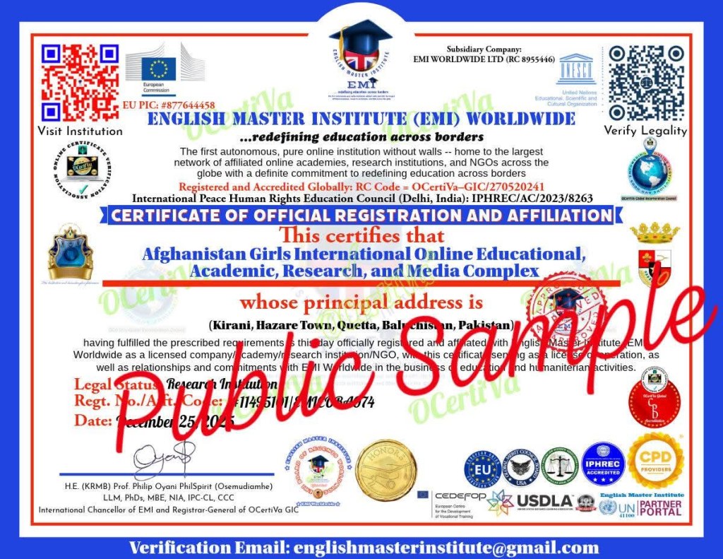 The English Master Institute (EMI) Worldwide hereby formally announces the successful registration, affiliation, global accreditation, and legal recognition of Afghanistan Girls International Online Educational, Academic, Research, and Media Complex within the global ecosystem of borderless education.