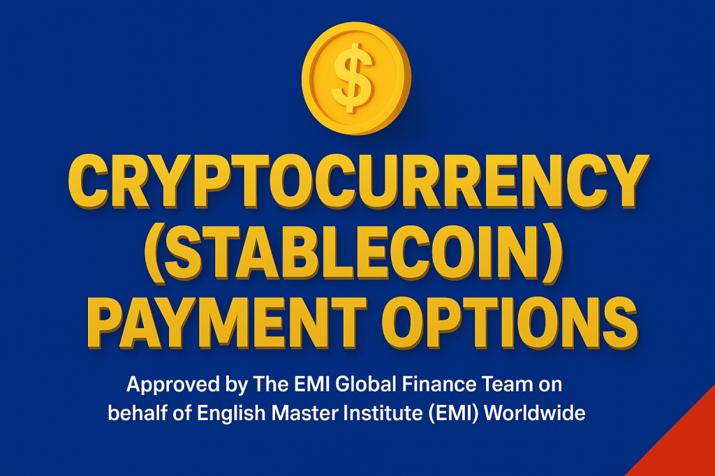 English Master Institute (EMI) Worldwide provides stablecoin payment options for clients, students, and partners who prefer to make payments via cryptocurrency.