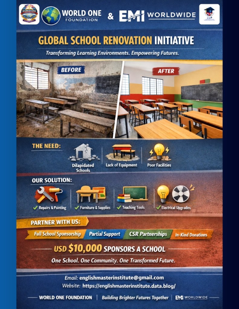 By leveraging a cost-efficient renovation model, the initiative delivers immediate, visible impact, while establishing a scalable foundation for long-term educational transformation under the shared vision of World One Foundation and English Master Institute (EMI) Worldwide.